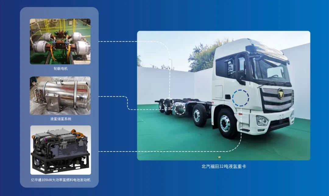 车辆搭载亿华通大功率氢燃料电池发动机系统,采用液氢系统及大功率轮毂电机,突破氢燃料电池商用车长里程、高功率和长寿命等关键核心技术,为长续驶重卡提出新的解决方案。