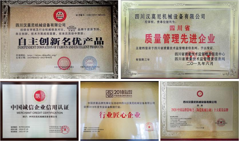 在自主创新产业意识的引领下,在刻苦专研理念的驱使下,汉莫尼连续多年被评为“国家高新技术企业”和“诚信企业”。近年来,汉莫尼在陶瓷机械设备生产领域获得了长足的发展,获得了《中国著名品牌》《科技成果》等国家证书,成为了目前世界工艺较为先进的淋釉装备之一,成就了一个又一个不朽的传奇。因为其世界首创又独特的设计方案还有良好的质量口碑,这也是众多知名品牌一直坚持合作和使用汉莫尼的真正缘由。