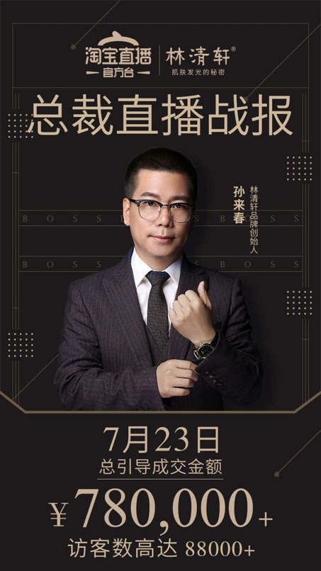 7月23日,淘宝直播官方台携手林清轩创始人孙来春,现身淘宝直播为林清轩粉带送福利,直播现场连线多位淘宝平台网红主播,气氛一度十分火热。共计超8.8万人观看,直播3小时销售金额达78万。