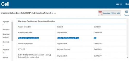在挖David Sinclair教授研究时发现其发表在《CELL》科学期刊上关于NAD+能够逆转血管衰老的论文当时用的原料是上文提到赛立复品牌的第一代原料。
