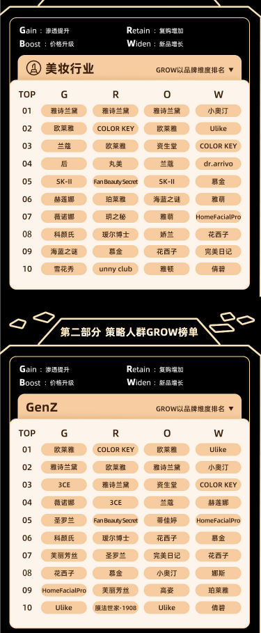 2019年,波士顿咨询公司(BCG)与天猫大快消推出了 GROW 增长工具。天猫数据部门负责人公布,在分析了近 4 万名消费者和数万个品牌后,GROW 已经可以作为数字化品类增长的抓手。经过复杂的数据演算和权重统计,天猫大快消部门公布了2020年度618的全品类GROW排行榜。