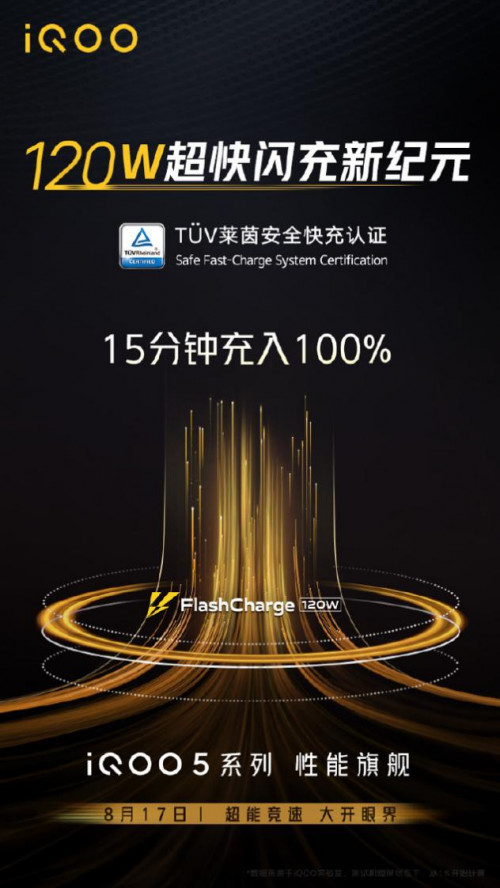 2020年8月5日,@iQOO手机 官方微博放出一张120分闪充海报,表达iQOO 5 系列将搭载120W 超快闪充技术,为用户带来15分钟充至100%的极速充电体验。这是业内首次将120W 超快闪充技术应用在手机上,不仅解决了用户对于效率工具的需求,也对5G高刷耗电的问题提供了一个高效解决方式,更是带领手机行业跨入百瓦闪充时代。