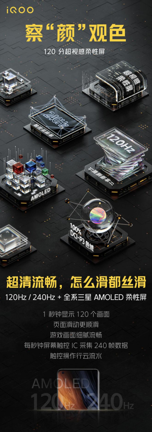 根据官方放出的功能海报来看,iQOO 5 系列带来120Hz超视感柔性屏,支持240Hz触控采样率,每秒钟屏幕触控IC采集240帧数据,再辅以三星AMOLED柔性屏,大大提升画面细腻度,在列表滑动、文字页面滑动等场景,体验更加平滑,跟手性更好,触控操作行云流水,快人一步。