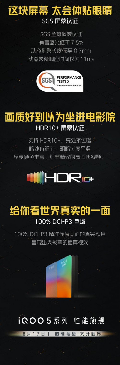 不仅如此,iQOO 5 系列屏幕支持HDR10+标准认证,更具有100% DCI-P3,精准还原画面真实颜色,让用户尽享颜色丰富、细节细致的高画面视频。值得一提的是,该屏幕已通过SGS全球权威认证,有害蓝光减少到7.5%以下,对眼睛更为“体贴”。