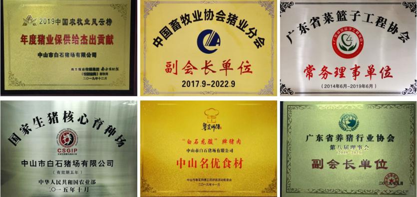 白石猪场自成立以来,始终坚持以产品质量为企业立身之本的理念,不但得到了行业和广大消费者的认可,还获得了政府及相关单位的肯定与褒奖。白石猪场龙骏种猪在2003、2006和2009年连续三届被评为“广东省名牌品”称号,龙骏牌肉猪获得国家《无公害农产品》认证,公司先后在中山市、珠海市开设了50多家白石龙骏”无公害猪肉专卖店,为中山珠海两地市民提供真正的无公害安全猪肉,受到了市民的欢迎。在中国农业博览会上,龙骏大白猪和龙骏杜洛克种猪双双获得名牌产品称号。龙骏种猪还被中国名牌商品协会评为全国同行业十大知名品牌。白石猪场连续多年被评为广东省养猪先进企业,先后荣获中山市先进集体、广东省职工职业道德建设先进集体、广东省先进集体、广东省工人先锋号、广东省“五一”劳动奖章、全国畜牧行业优秀企业、全国养猪行业百强优秀企业、中国改革开放养猪30年企业自主创新发展成就奖等光荣称号。早在 2001 年就在同行业中脱颖而出, 率先通过ISO9001:2000 国际质量管理体系认证,发挥其卓越优势, 成为国家第一批生猪核心育种场、全国生猪标准化示范场、国家重大专项研究基地、国家科技部农业科技成果转化基地、国家生猪产业体系中山综合试验站,以及“十五”国家重大科技专项食品安全关键技术广东示范基地、广东省健康农业科技示范基地、广东高校产学研结合示范基地。与此同时,白石猪场还荣获中国畜牧业协会常务理事单位、中国畜牧业协会猪业分会副会长单位、中国机械化养猪协会副会长单位、广东省养猪行业协会副会长单位、广东省菜篮子工程协会常务理事单位、广东省原种猪场、广东省名特优新农产品、“白石龙骏猪” 品牌为首届(中国)健康美食品鉴会食材指定供应商、中山名优食材以及粤港澳“大湾区” 菜篮子生产基地认定证书、2019 年中国农牧业风云榜“年度猪业保供给杰出贡献奖”等一系列荣誉。