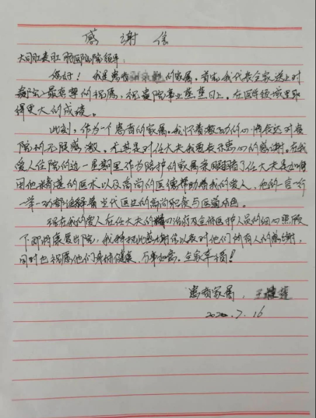 2020年7月16日早晨,大同肛泰肛肠医院任毅主任和全体工作人员一封感谢信。向医护人员表达着同一种感谢之情!