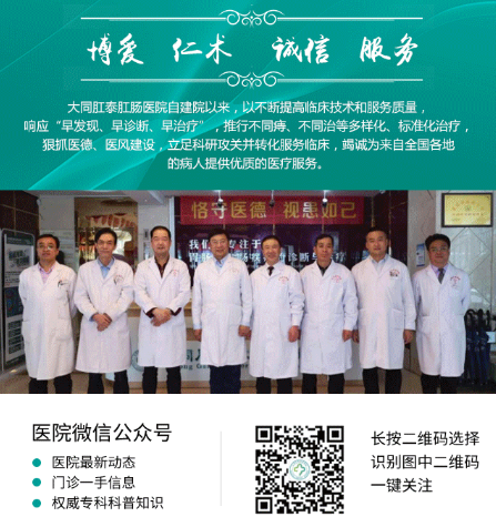 大同肛泰肛肠医院始终以‘爱心、诚心、耐心、细心、责任心’的服务理念为病人提供最优质的服务,打造一支优秀的团队!”做有品质的医疗,做有温度的医者 ,肛泰全天成员将在患者的鼓励和信任中继续努力,用厚德博爱的医者情操,精医卓越的人文医术为病友服务。