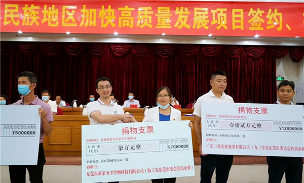 8月5日,东莞统一战线帮扶韶关民族地区加快高质量发展项目签约和捐赠活动在乳源瑶族自治县举行。东莞市委常委、统战部长陈志伟,韶关市委常委、副市长、东莞市政协副主席、莞韶指挥部总指挥罗晓勤,韶关市委常委、统战部长颜珂等领导出席活动。我司梁杰文先生作为农工党员代表参加了捐赠活动,并为此次活动捐赠7万元医疗器械和药品一批,充分展现我司的责任担当和无私奉献。