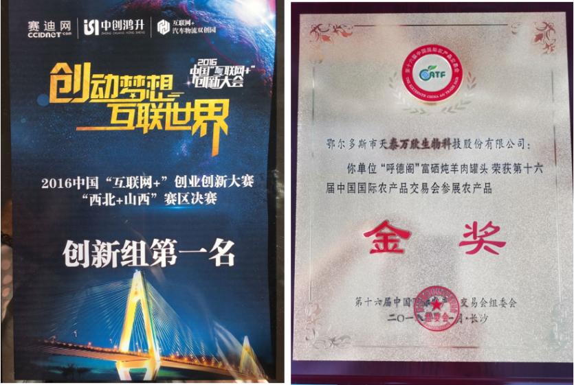 2017年11月10日,第四届内蒙古品牌大会在呼和浩特召开,这个大会见证了内蒙古自治区品牌的创新与成长。在此次大会上,天泰万欣从众多品牌中脱颖而出,得到参会专家和企业家的一致好评,以2.35亿元的品牌价值与伊利、蒙牛、燕谷坊等100家企业共同荣登“2017内蒙古名片百强品牌榜”;天泰万欣系列产品荣获“2017内蒙古名片百佳农特推荐产品”;董事长伊拉塔先生更是荣膺“2017内蒙古品牌人物—内蒙古品牌建设榜样奖”。2018年,经过中科院、农科院,国家卫计委等相关专家的评审鉴定,天泰万欣与中国科学院共同获得两项发明专利:牛用富硒饲料及其喂食方法和羊用富硒饲料及其喂食方法。在第十六届中国国际农产品交易会上,鄂尔多斯市天泰万欣生物科技股份有限公司阿尔巴斯富硒炖羊肉罐头荣获国际农交会金奖。