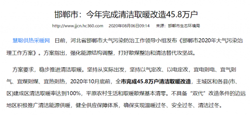 近日,河北省邯郸市大气污染防治工作领导小组发布了《邯郸市2020年大气污染治理工作方案》。方案指出,强化能源结构调整,打好散煤整治和清洁替代攻坚战。