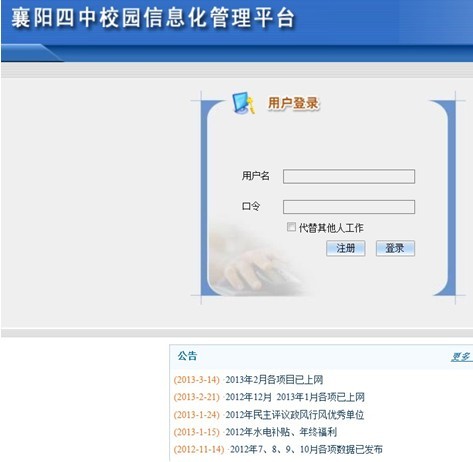 信息化软件实施背景:  据了解,湖北省襄阳市第四学校目前有近万在校学生,有义务教育部、体育部、高中部,涉及义务教育到高中阶段教学,专任教师570余人。在各级领导的关怀下,我校非常重视信息技术在教学中的应用,每年在信息技术方面的投入大量资金,充分发挥省示范高中的带头作用,率先引进各类信息技术融入到教育中:教室多媒体,录播教室,网络教学等,对教学起到了非常积极的作用。并在近期成功申请“全国百所数字化示范学校”的称号。学校先后购买多家公司的知名管理软件,但是由于和实际情况不符合,出现“水土不服”的现象,需要定制,费用较高,周期很长。