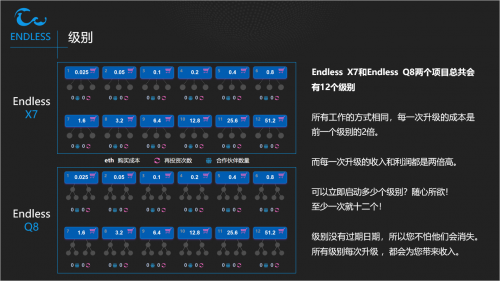 初始投入0.05ETH 激活第一个等级,也可以激活多个等级,等级激活可以更具自己的市场发展状况而定,来逐渐升级。