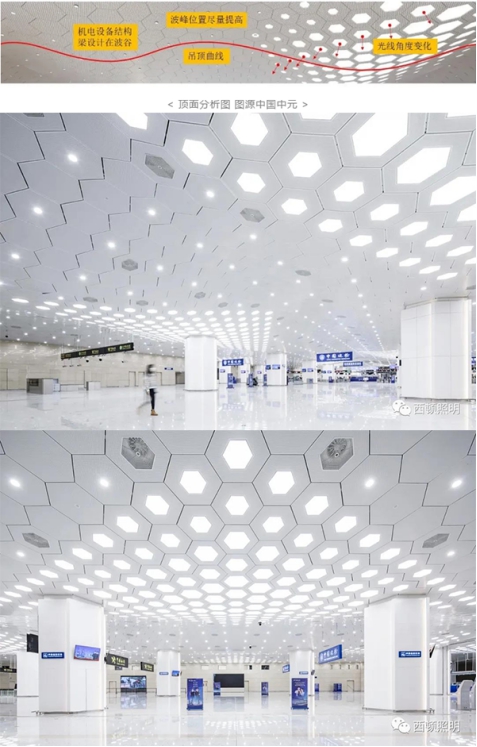 首先,灯具的安装方式不能完全垂直向下,有一些要斜向照射,以使光线更加均匀舒适;其次,要尽量采用漫反射照明的灯光膜,避免眩光效应。而曲线顶面造型结合六边形大小渐变的灯具,恰好体现了横琴沿海轻松、浪漫的地域特色。张凯表示这简直是意外之喜。“其实,我们是立足于功能才设计了这样的形式。却在灯光作用下却有了意外收获,也属巧合,希望这份意外之喜能成为横琴口岸的新名片吧!”