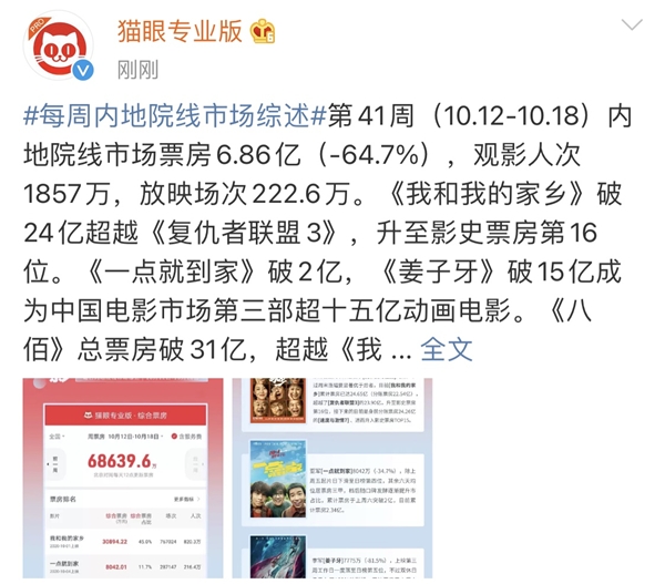 曾几何时,中国院线票房榜长期被北美电影所霸榜,好莱坞、环球、迪士尼……在中国市场疯狂吸金。但在国内电影逐渐崛起的当下,我们看到的是如《我和我的家乡》这样的佳片,拿下超24亿票房,一举超越《复仇者联盟3》,跃居影史票房第16位。而这部笑中带泪的《我和我的家乡》,是对全面建设小康社会收官之年的最好献礼。