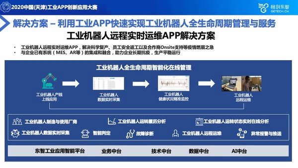 格创东智的参赛方案《工业机器人远程实时运维APP的快速开发和应用解决方案》来自于疫情期间的洞察。工业机器人在工厂被广泛应用,以半导体液晶面板流程化全自动生产为例,在200多道生产工序中都可以看到工业机器人忙碌的身影。企业每年需要付出采购价格的20%用来保证机器人处于正常工作状态。而疫情的爆发导致设备服务商无法到达现场维保,而企业又不可能开放生产网络给设备服务商远程维护设备,导致产线工业机器人长期处于“裸奔”状态,给生产带来极大的风险。