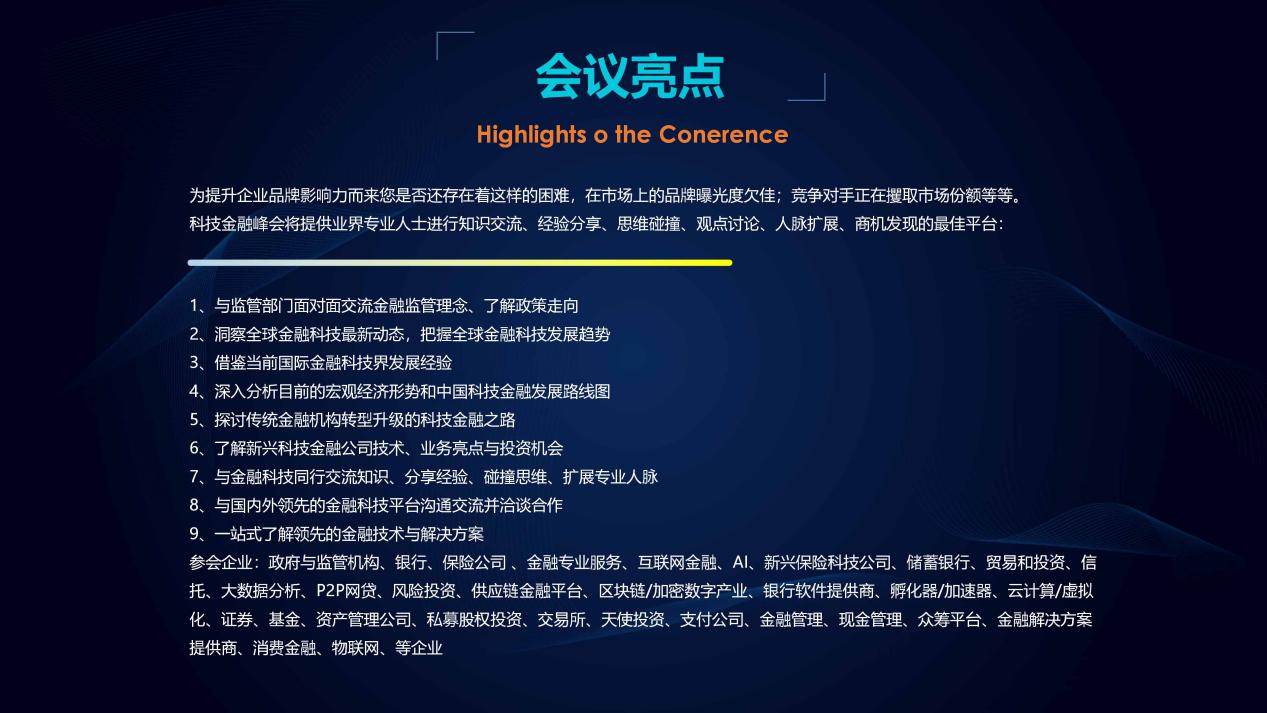 参会企业:政府与监管机构、银行、保险公司、金融专业服务、互联网金融、AI、新兴保险科技公司、储蓄银行、贸易和投资、信托、大数据分析、P2P网贷、风险投资、供应链金融平台、区块链/加密数字产业、银行软件提供商、孵化器/加速器、云计算/虚拟化、证券、基金、资产管理公司、私募股权投资、交易所、天使投资、支付公司、金融管理、现金管理、众筹平台、金融解决方案提供商、消费金融、物联网、等企业