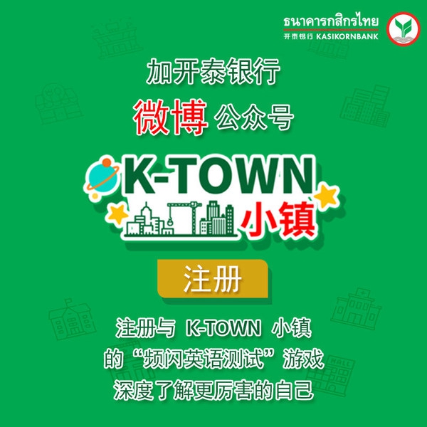 即日起,只要关注“开泰银行”微博公众号(kaitai_kasikornbank),注册K-Town小镇并登陆,即可体验有趣的游戏,通过其中的测试,发现自己英语水平,值得一提的是,还可以根据自己的人生经历和故事,建设独一无二的、属于自己的城市。同时,参与“Better Me”测试并与朋友分享,不仅可以帮助用户更好地了解真实的自己,更可以获得K-Reward积分,有机会获得精美奖品。