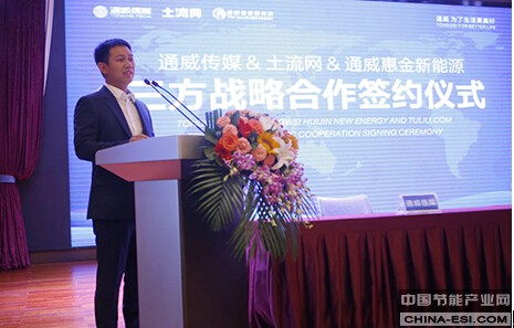 在签约仪式上,土流网创始人兼CEO伍勇、通威惠金新能源有限公司总经理冯德志、通威传媒总经理甘晓飞先后发言。