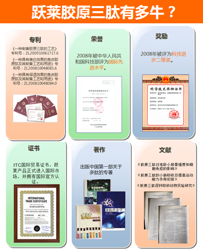 跃莱公司所运用的胶原蛋白,是从世界500强企业嘉吉原德国德固赛公司采购的由世界顶尖级一流胶原蛋白生产线生产出来的牛骨胶原蛋白原料,经过本公司具有自主知识产权的“复合酶梯度定向酶切”技术加工后,所生产出来的小分子胶原蛋白——“胶原三肽”所做成的!