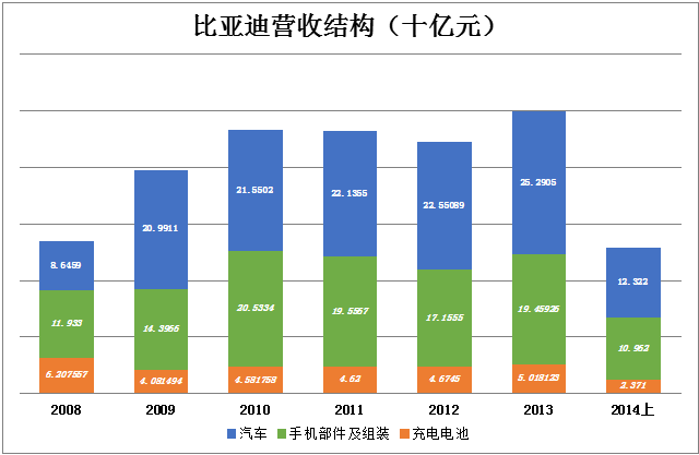 2009年开始,比亚迪业绩结构趋于稳定,汽车、手机、电池座次排定,甚至各部分营收都几乎没有变化。