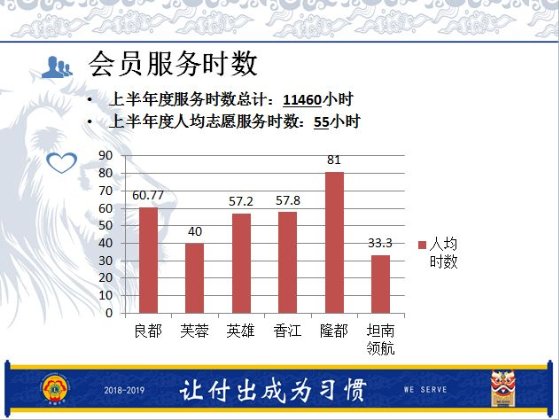 上半年度狮友总服务时数1794小时,人均服务时数57.8小时,动议服务经费49.6万元;包括:助残服务共开展3项、助学服务(校园升级改造)开展6项、敬老服务5项、应急救灾服务3项、捐助狮爱路灯28盏、捐助视觉第一复明手术10例、爱芯工程设备1套、红色行动(无偿献血)、和平海报、糖宣服务。