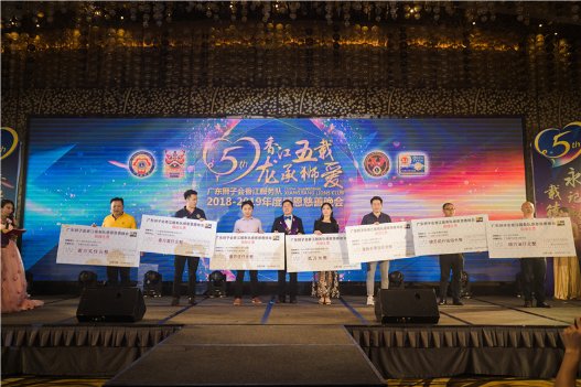 大汇堂红木销售总监汤青连(右四)捐款105000元、唐百年红木总经理胡春龙(右四)捐款30000元,中山横栏靓丽口腔门诊部总经理陈威(左三)捐款15000元上台接受支票交接,广东狮子会香江服务队1819年度队长胡春龙狮兄颁发支票奖牌