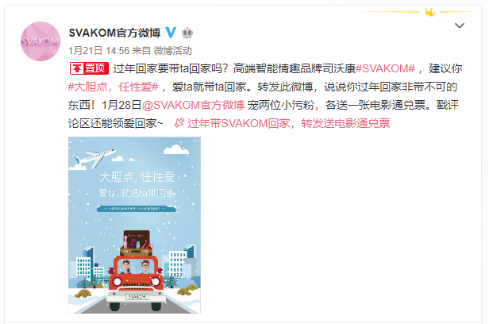 美国情趣品牌SVAKOM在新浪平台上发起了#大胆点,任性爱#,爱ta就带ta回家的品牌联动直发活动,20家品牌及KOL一同发声,了解现在人们过年必须带回家的东西,同时鼓励年轻人大胆追爱,带上心仪的对象回家,让长辈们乐乐呵呵过新年。