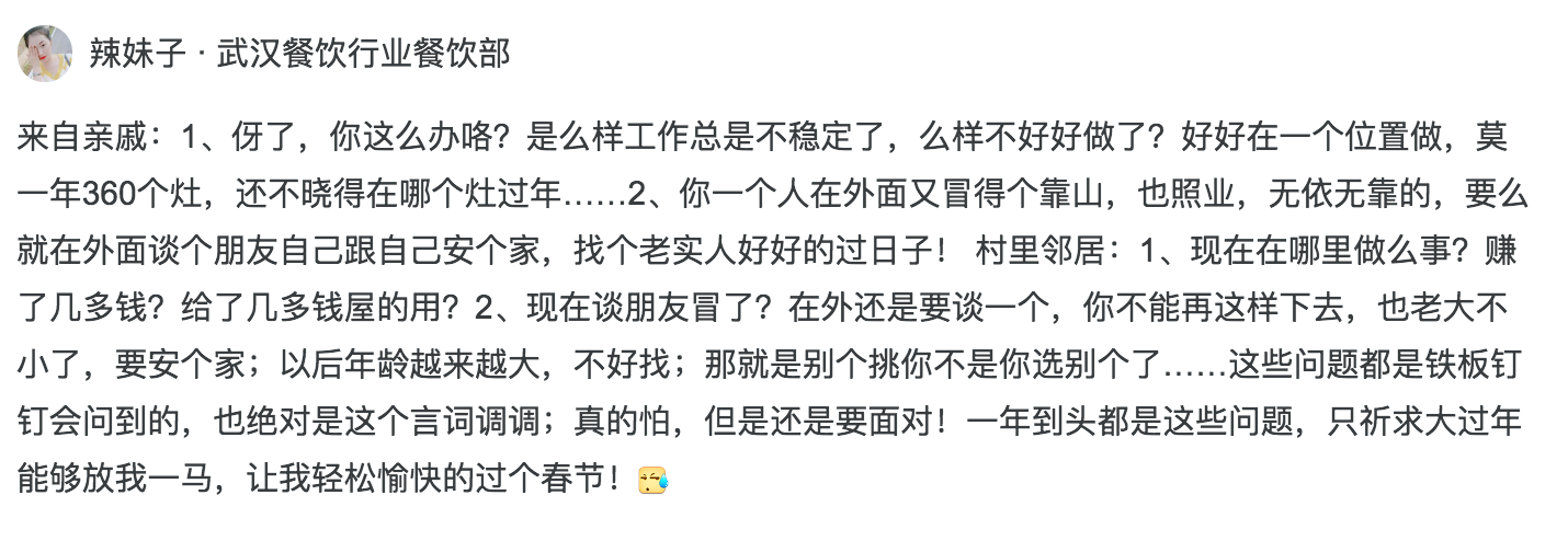 SAP中国方案负责人王磊在脉脉上表示:还单身,非得问“何时结婚”;没孩子,非要问“何时抱小孩”;穷得叮当响,非要问“何时买房”;京沪限制牌,非问我“何时买车”。上面这四大问题,每一句都扎心不已,让辛苦了一年回家寻求温暖的职场人,又一次体会了内心拔凉拔凉的感觉。