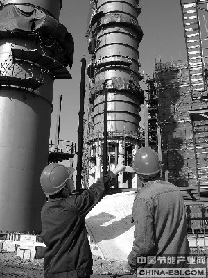 为消除装置安全隐患,实现节能降耗,增强竞争能力,大庆石化公司正在进行常减压节能改造项目的建设。目前塔框架、钢结构完成了百分之六十,常压塔完成五段施工任务,减压塔完成四段施工任务。该项目将通过提高原油炼制技术水平改善装置馏分质量,降低全厂综合能耗,解决现有常减压装置安全隐患,增加经济效益。图为炼油厂原常减压装置人员正在对照图纸查看施工现场情况。