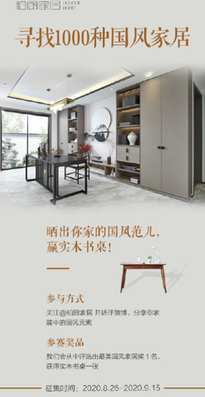 在获得大批量粉丝的同时,柏厨创新新玩法,开始搭建私域流量,深度沉淀并管理已有用户。8月于品牌升级发布会时,在微博发起“未来设计是否会被智能替代”“寻找1000种国风”话题讨论活动,每个话题阅读量从未低于百万;国庆节期间“云旅游,寻国风”一度将2020年主推的“至简国风”家居理念推向高潮。同时平日里的柏厨更是抽奖活动不停歇,每隔一段时间就会有抽奖活动,加强与消费者的沟通与对话,铺垫品牌在受众心中的地位,加深品牌美誉度。而微信平台已逐渐形成具有品牌特性的互动平台,创建多个H5小游戏互动,拉近与受众的距离,加强对话。