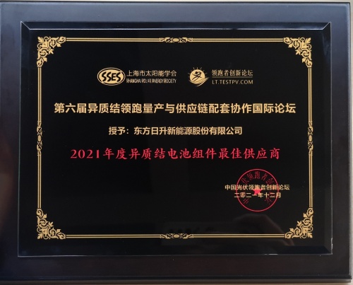 1月13日,“第六届异质结领跑量产与供应链配套协作国际论坛”在无锡圆满落幕,全球异质结领域顶级机构与领跑企业齐聚盛会,探索平价时代异质结技术的发展新契机。高功率组件技术领先企业东方日升受邀出席活动,并凭借高效N型电池技术与一体化实力,同时荣膺“2021年度异质结电池产业领跑先锋奖”、“2021年度异质结电池组件最佳供应商”。
