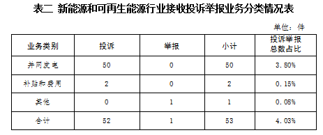 新能源和可再生能源行业排在第二位,数量为53件、占投诉举报总数的4.03%,主要集中在并网发电、补贴和费用等方面。
