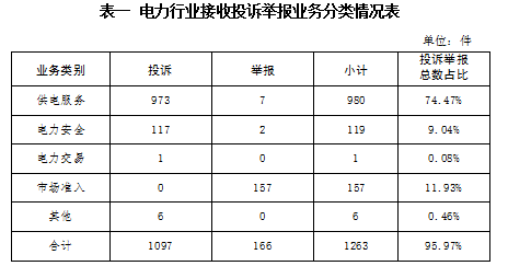 电力行业排在首位,数量为1263件、占投诉举报总数的95.97%,主要集中在供电服务、市场准入、电力安全等方面。