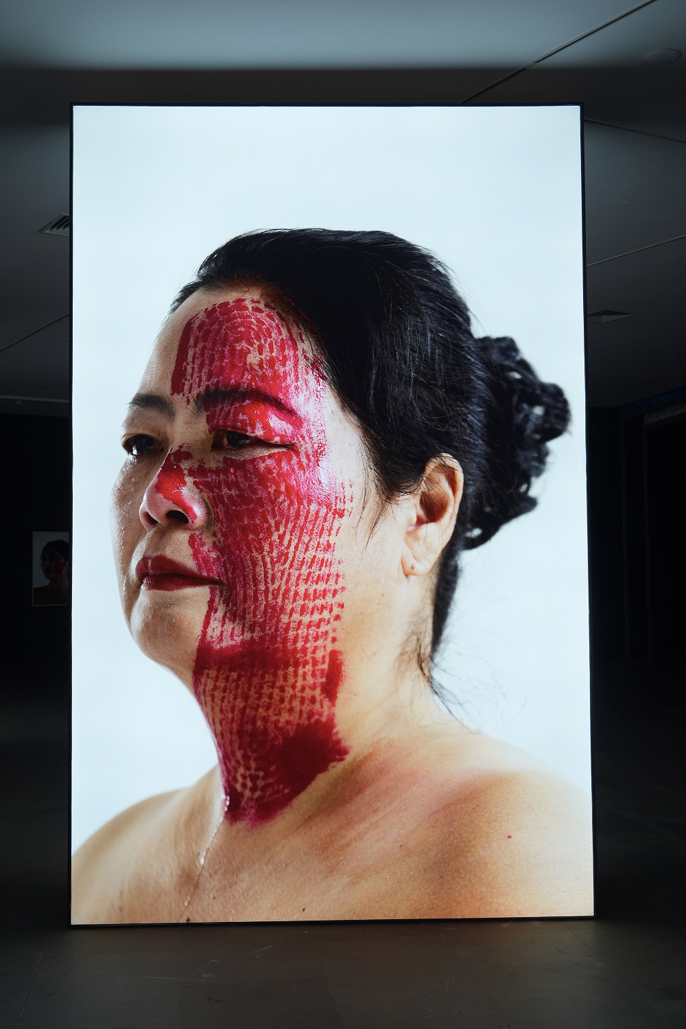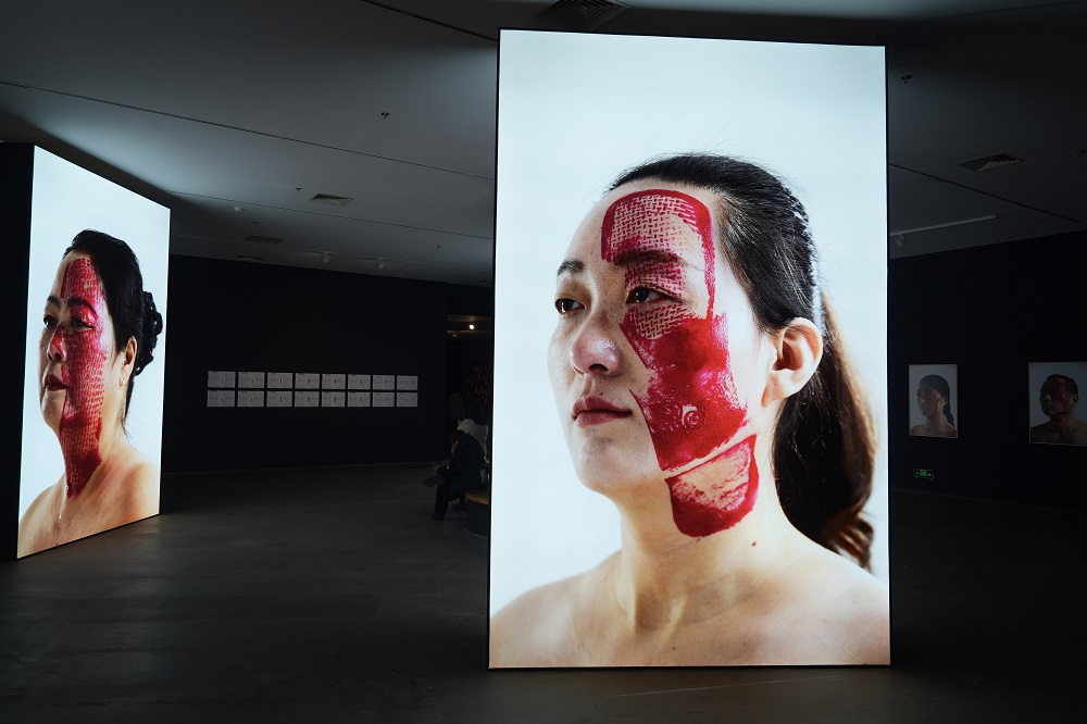 杨烨炘邀请五十位普通人,由各自生命中至关重要的“他者”,将蘸满红色颜料的鞋底踏印在脸上。“每一张脸庞,都是承载关系的画布;每一个红印,都是情感、权力或记忆的实体烙印。”杨烨炘如此阐释。父母之印或许隐喻着家庭期待的压力,上司之印可能指向职场等级的压迫,昔日恋人之印则仿佛凝结着未释怀的情感淤伤……这些鞋印,不仅留在皮肤上,更指向那些无形中塑造我们、伤害我们或定义我们的关系结构。