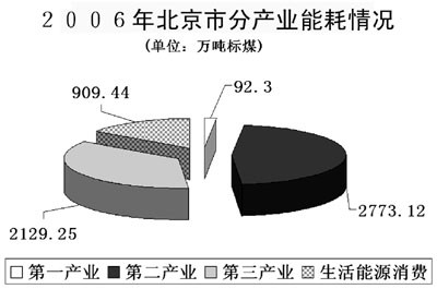 目前,北京第二产业单位产出能耗依然较高,但也在发生积极变化,万元增加值能耗从2004年的1.44吨标煤下降到2006年的1.265吨标煤,占全市能耗总消费量的比重也从51.8%下降至47%。变化来自于第二产业内部结构调整:一方面,不断淘汰高耗能的落后生产力;另一方面,扶持与发展低能耗、高附加值的高新技术产业和现代制造业。以现代制造业为主的亦庄经济技术开发区万元GDP能耗仅0.16吨标煤。
