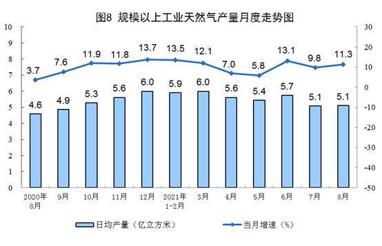 天然气生产有所加快。8月份,生产天然气159亿立方米,同比增长11.3%,增速比上月加快1.5个百分点,比2019年同期增长15.5%,两年平均增长7.5%,日均产量5.1亿立方米。