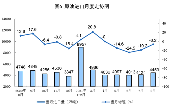 1—8月份,生产原油13322万吨,同比增长2.4%,比2019年同期增长4.0%,两年平均增长2.0%;加工原油47079万吨,同比增长7.4%,比2019年同期增长10.8%,两年平均增长5.3%。
