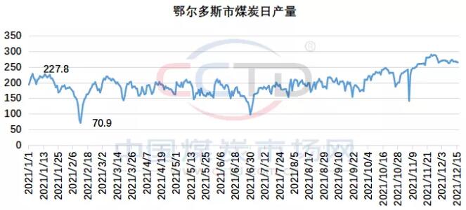 煤炭供应高位维稳。根据CCTD中国煤炭市场网监测的数据显示,12月16日当周,鄂尔多斯日均产量268万吨/日,周环比持平。