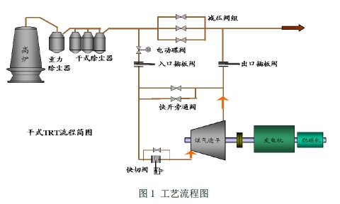 高炉煤气经重力除尘器、干式除尘器(一般为布袋除尘器)两次除尘后,在减压阀组前经过入口蝶阀、入口插板阀、快速切断阀进入透平膨胀机膨胀做功驱动发电机发电,膨胀后的高炉煤气压力约为10kPa,经过出口插板阀、出口蝶阀进入减压阀组后的煤气总管道去工艺。高炉炉顶压力通过改变透平静叶的工作角度来控制,满足机组变工况的要求。工艺流程见图1。