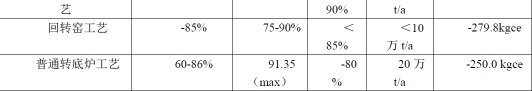 依据表1中数据计算得出,蓄热式转底炉工艺比回转窑工艺节能约70kgce/t产品,节能约25%;比普通转底炉工艺节能约40 kgce/t产品,节能约16%。