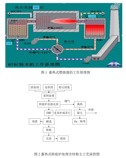 蓄热式燃烧技术及蓄热式转底炉处理含锌粉尘工艺流程图见图1、图2.
