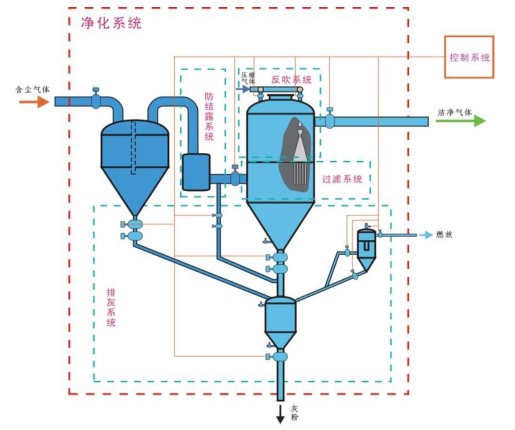冶炼烟气净化系统分为过滤系统、反吹系统、防结露系统、排灰系统和控制系统等五个子系统,其结构示意图见图2。