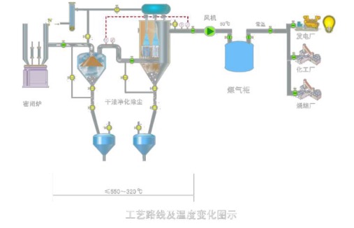 该技术的关键是高温烟气的除尘净化技术,也是后续烟气发电和铬粉矿煤气烧结(预处理)的基础。主要技术原理是采用全封闭矿热炉冶炼和控制技术,将冶炼所产生的高温烟尘通过FeAl非对称过滤器进行干法净化,并将净化后的烟气输送到煤气柜中储存,用于发电和铬粉矿煤气烧结,起到节能效果。