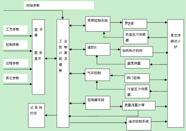 工件→清洗→生成或编制工艺→装炉→真空渗碳→淬火或冷却。其结构图及自动控制系统示意图分别见图1和图2。