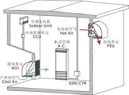 A、当机房内部温度上升到需要散热温度(或指定温度)时,自动打开百页窗,利用直流风机引入室外空气,并排出室内的热空气而形成空气对流,达到降低室内温度的目的。为了保证进风洁净,在进/排风道加装专业的空气过滤网。